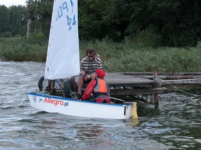 Optimist (nie Optymist) dlugość kadłuba 2,3 m pow. żagla 3,5 m2.